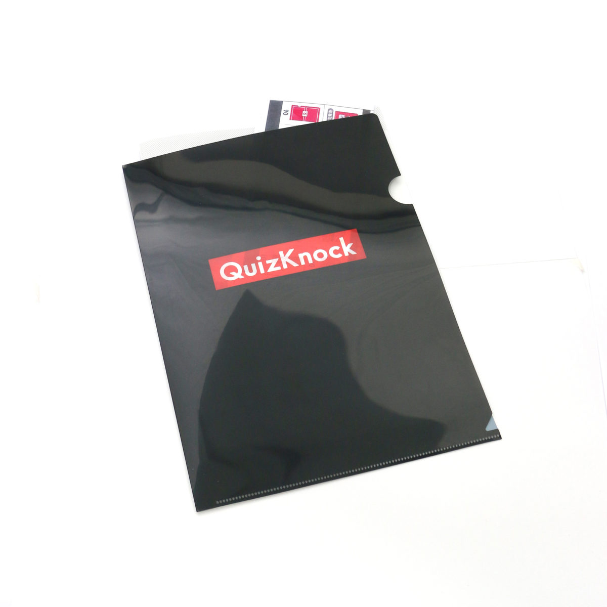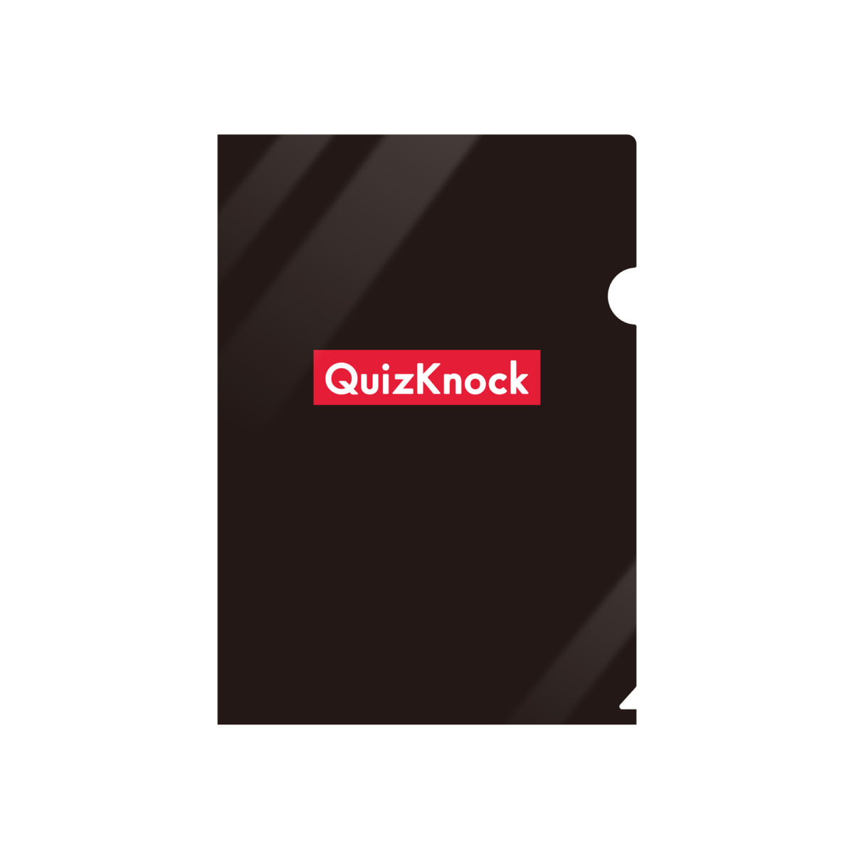 QuizKnock(クイズノック)公式グッズより、ブラックに赤白のロゴがクールなA4ファイル。表はQuizKnockの赤白ロゴ、裏はブラック一色の無地になります。