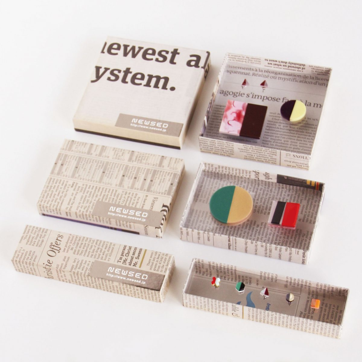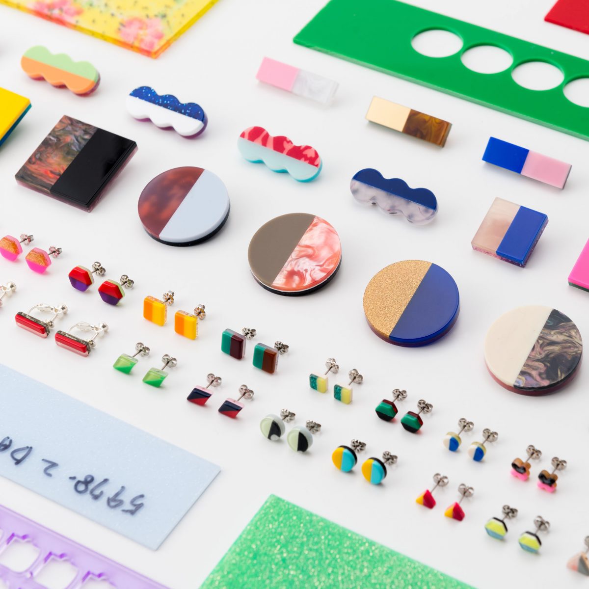 ショップオリジナルの什器やアクセサリーなどは、特注の色柄のアクリル板を使用して製作していますが、その際、必ず端材が出てしまいます。その端材の出方はサイズもバラバラで型を抜いて使用出来る部分が無い物や、特注で作られたアクリルの為、他での使用が出来ないものなど様々です。それらの特徴のある端材を組み合わせてつくられた、ほぼ1点物のバッジ・ピアスがセットになったギフトボックです。