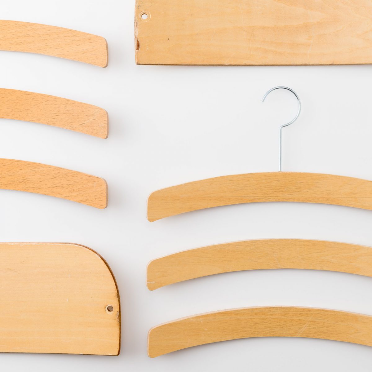 学校の椅子の背板を利用した、ハンガーです。学校生活の中で、椅子の背板は何気なく上着をかけるのに使われていました。破棄される運命にあった椅子の、そんな無意識の記憶をカタチにしました。