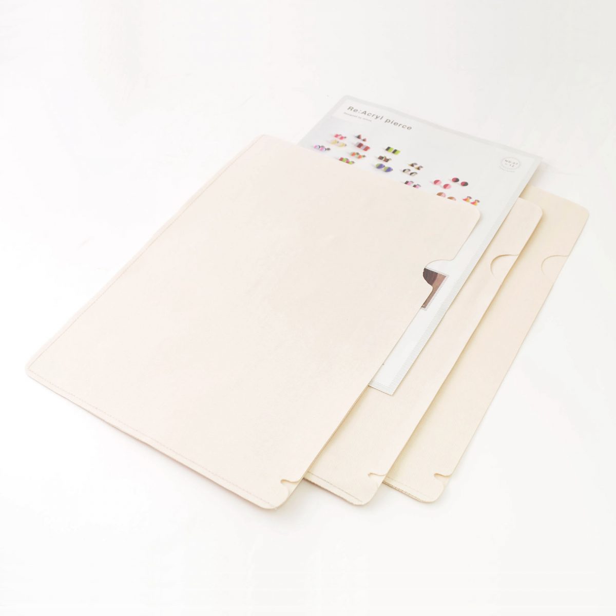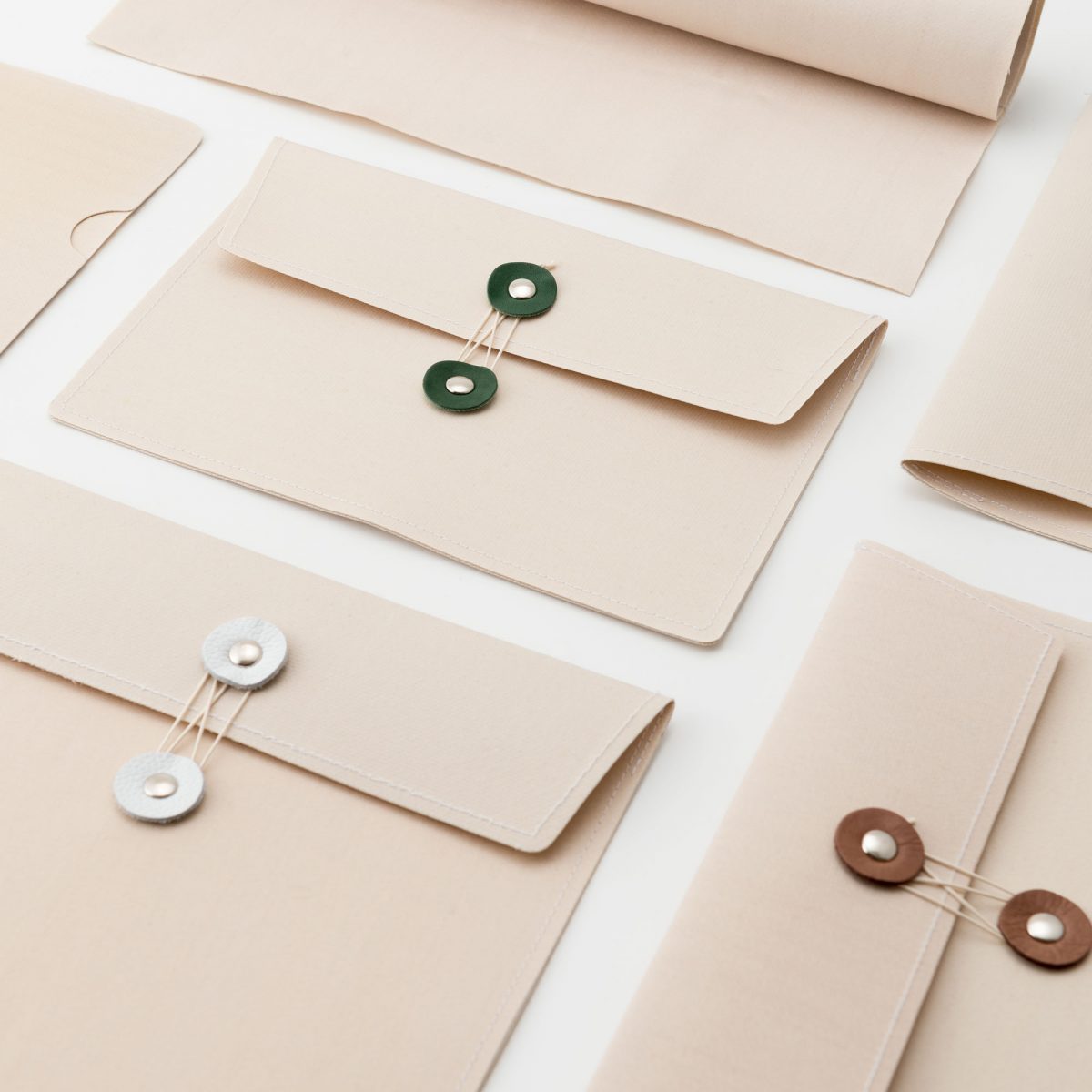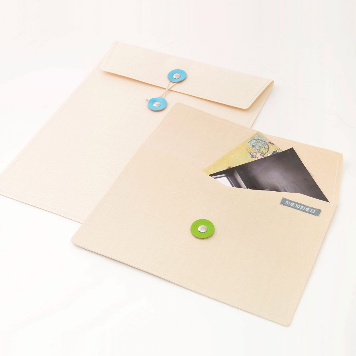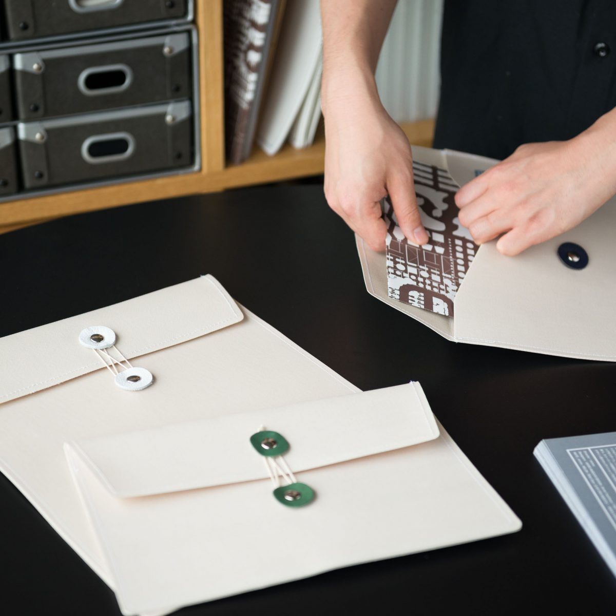 東京ドームにも使われているテント生地の端材を使った、書類フォルダと書類ファイルです。ドームの生地に使われるものなので、強度は抜群で、100年は劣化しないと言われ、もちろん耐水性も備えています。それらの素材特性を活かして作られています。