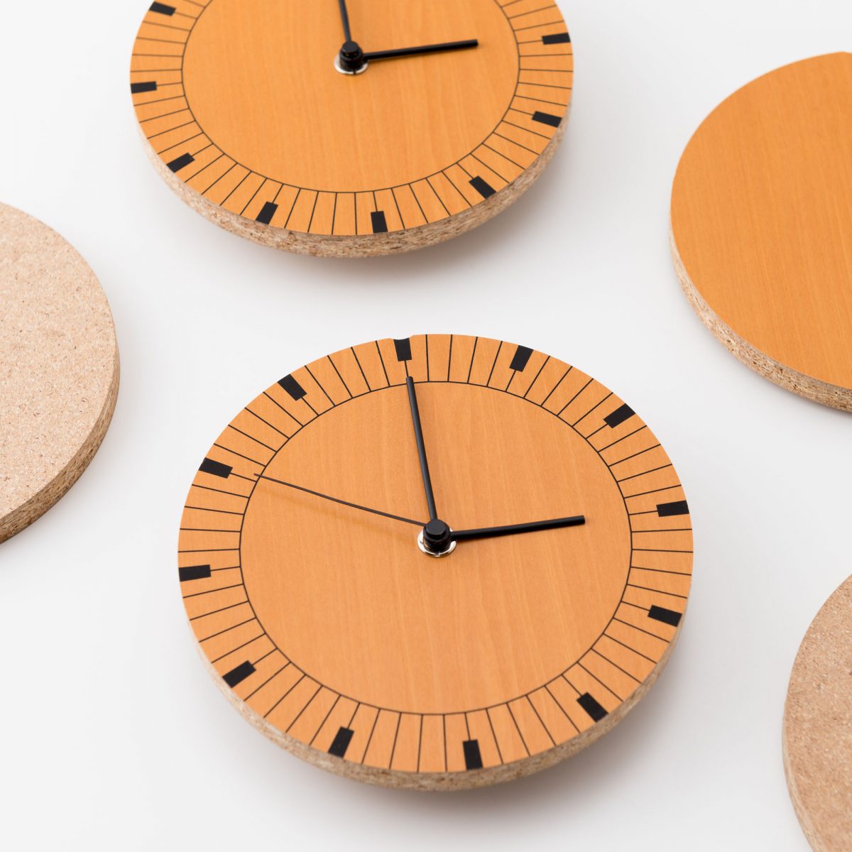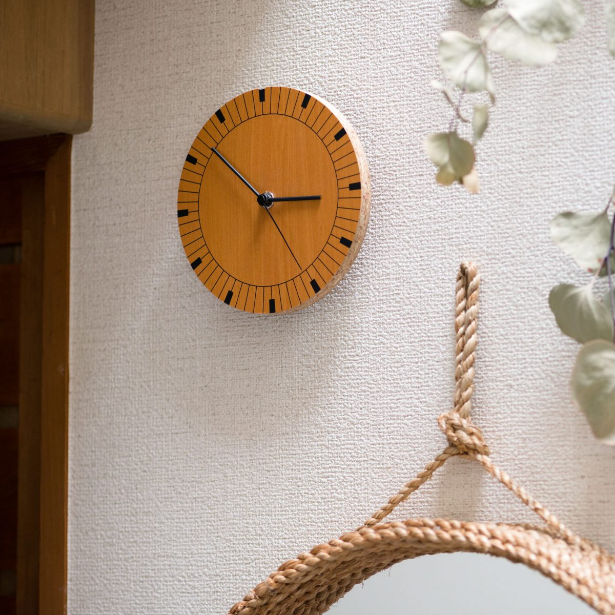 オルガンのスピーカー部分を取付ける際に、丸くくり抜かれた木の端材を使用した時計です。 素敵な音を奏でるオルガンの端材が、生活の時を奏でる時計へと生まれ変わりました。