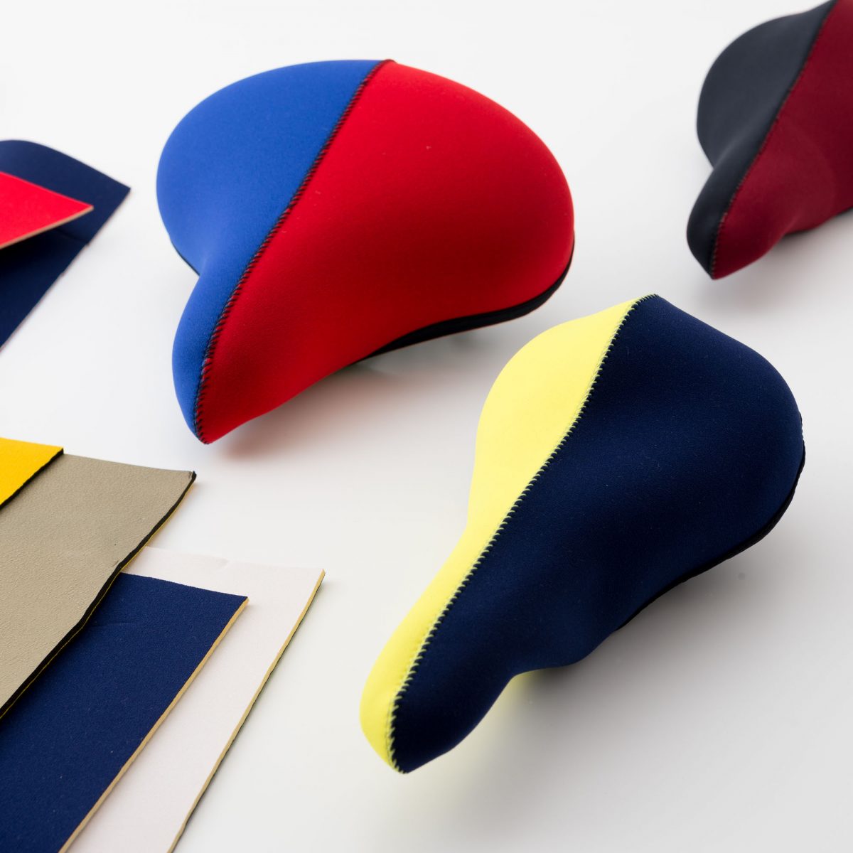 廃棄されてしまうウエットスーツ生地を使用したサドルカバー。オーダー製作された生地ならではのカラフルなカラーを活かし、伸縮性や耐久性等の特徴を活かすため、表面だけすくって縫う「すくい縫い」を採用しウエットスーツと同様の仕上げをしています。
