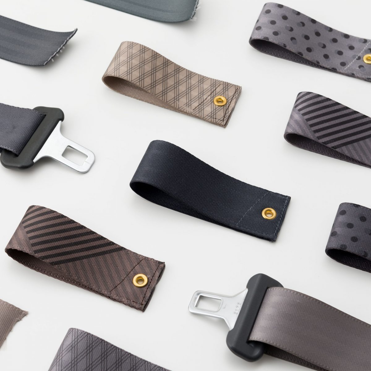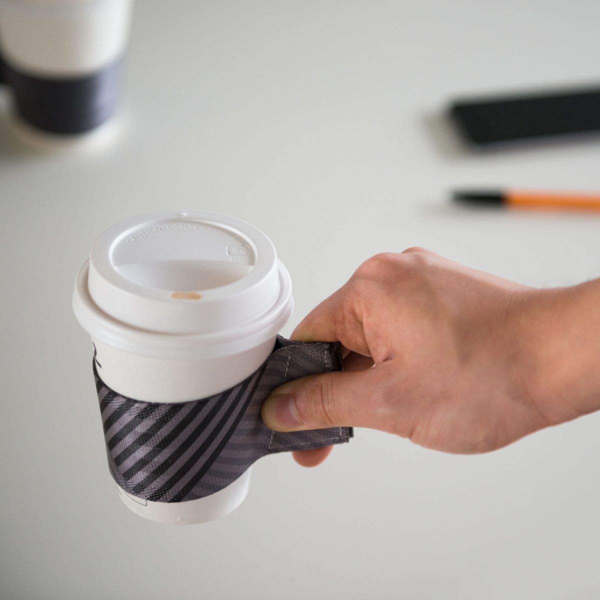 役目を終えたシートベルトが生まれ変わった、コーヒーカップをホールドするためのスリーブです。シートベルトの素材感や強度を活かし、熱さが緩和され、持った時の手触りもなめらかなのが特徴です。