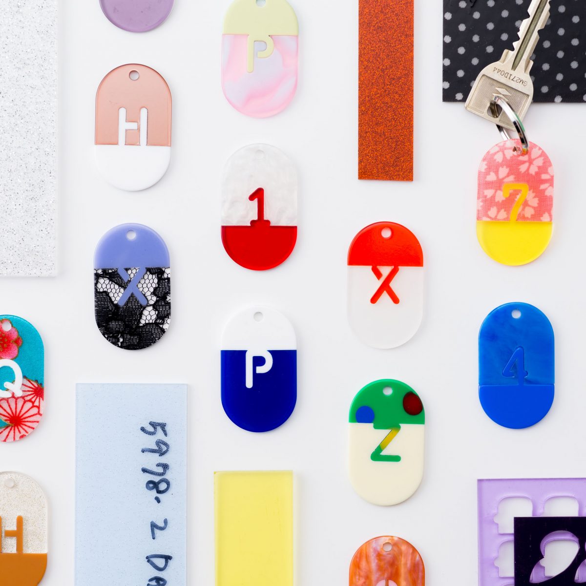 色柄に特徴のあるアクリル端材を使用してつくられた、鍵などに取付けるタグプレートです。アクリル端材の色柄と文字の組み合わせによって、世界にひとつだけのタグプレートが出来上がります。