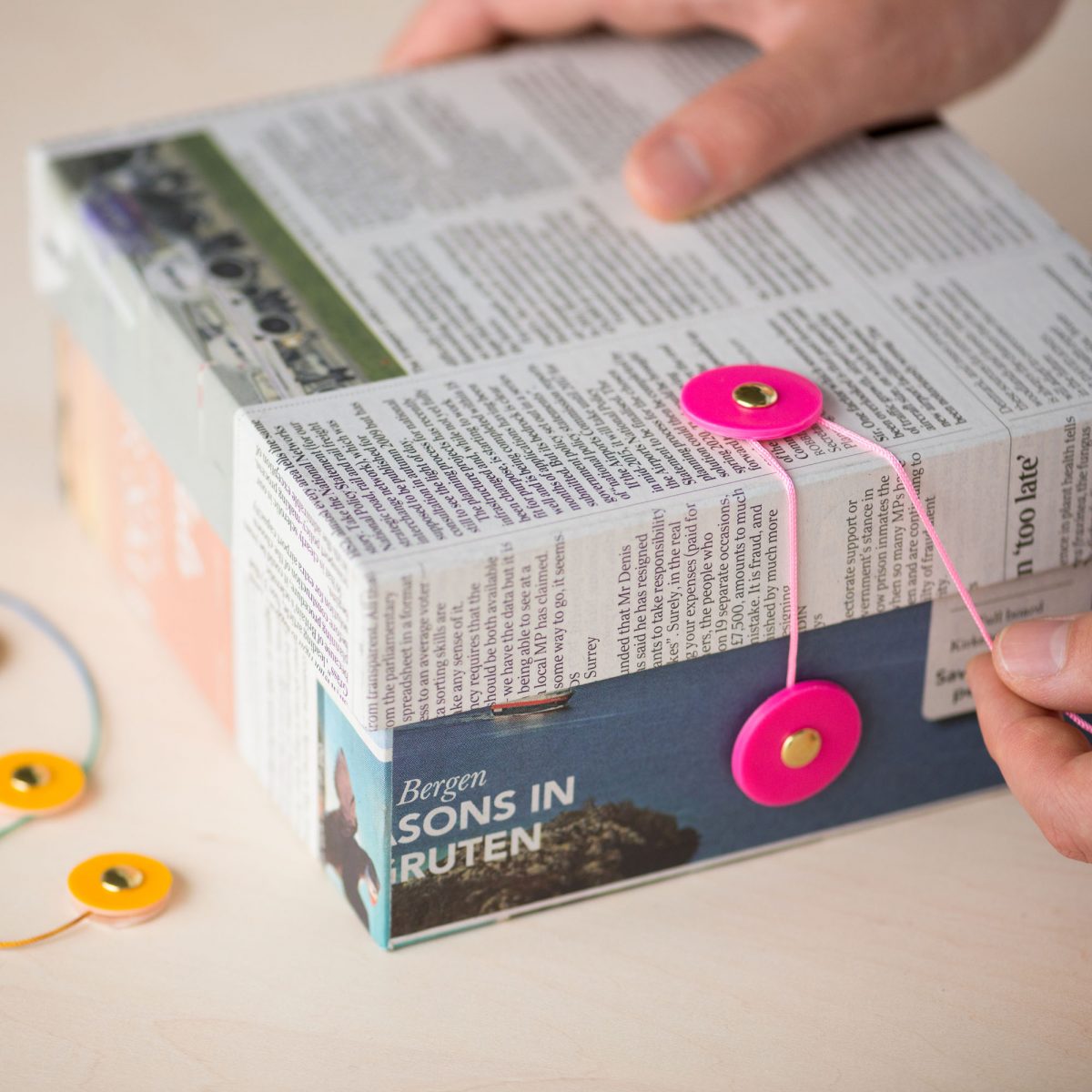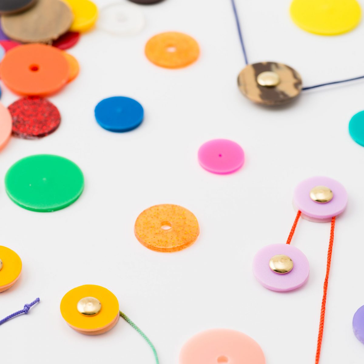 ソフトビニール人形(ソフビ)の胴体と腕・足部分をつなぐ際に端材として出てしまう丸型の抜きカス。その抜きカスのサイズ感や色味、「つなぐ」というストーリーを活かした、留め具シールです。